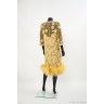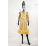 PIROVANO COUTURE - 1960's ROBE COCKTAIL en tulle jaune rebrodé de perles diverses et de strass, ourlet garni de plumes d'autruche, doublure en crêpe de soie Griffe blanche, graphisme noir Env. T S Micro manques probables
