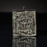 Plaque en bronze de forme carrée représentant le Christ trônant entre la Vierge et saint Jean (?); tête du Christ encadrée des lettres en grec IC XC (Iêsous Christos) et lettres MP OY (initiale de Mêtêr Théou qui signifie Mère de Dieu) au-dessus de la tête de la Vierge ; bordure moulurée et bélière. Empire Byzantin, Russie, XIIe siècle H totale 5,9 × L 4,8 cm (petit accident à la partie inférieure, légère usure)
