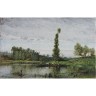 Plaque rectangulaire en terre cuite émaillée à décor polychrome d'une vue d'étang avec barque. Signée et datée M Bouquet 1871. Fin du XIXème siècle. 36 x 24 cm. Provenance : Succession de M D.