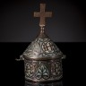 Pyxide en cuivre champlevé, émaillé, gravé et doré. Emaux bleu lavande, bleu turquoise et blanc. Corps et couvercle conique à décor du monogramme christique IHS accompagné d’une croix pattée dans des médaillons et de rinceaux de palmettes dressées ; extrémité de la prise de la fermeture en forme de tête de dragon stylisée ; couvercle sommé d’une grande croix. Limoges, troisième quart du XIIIe siècle H 14,7 × Ø 7,5 cm (accident et manque près de la fermeture, émaux usés, restes de dorure seulement à l’intérieur du couvercle, soudures sur le bord du fond)