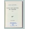 ÉDITION ORIGINALE. In-8 (215 x 141mm). TIRAGE : un des 50 exemplaires de tête imprimés sur vergé blanc de hollande, seul grand papier, celui-ci numéroté 39. RELIURE SIGNÉE DE MIGUET. Maroquin rouge, plaques de papier rouges peintes au pochoir, dos long, tranche supérieure dorée, non rogné, couverture et dos conservés. Étui. NOTE AUTOGRAPHE DE FRANÇOIS MITTERRAND : "Pascal Quignard, Tous les matins du monde, ed. or. 850 (fr.) chez Gallimard, 1991"