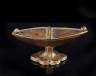 Rare navette à encens en cuivre gravé et doré de forme oblongue reposant sur un pied polylobé. Couvercle à deux valves à décor de feuilles déchiquetées autour d'un fleuron et accompagnées de rosettes sur fond quadrillé ; prises en forme de boule ; bord du pied mouluré et orné d'une frise de perles. Italie, dernier tiers du XIVe siècle H 10 × L 20,5 cm (Enfoncement à une prise, usures à la dorure)