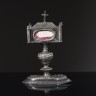 Reliquaire monstrance en argent repoussé et ajouré. Fût en balustre orné de groupes de fruits avec base en collerette godronnée, base ovale à décor de feuillages et de guirlandes, boîte en forme de chasse avec oculus ovales et tourelles aux angles surmontées de cœurs enflmmés, toit à écailles couronné d’une croix. Auvergne, seconde moitié du XVIIe siècle H 26 cm