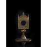 Reliquaire-monstrance en laiton moulé, gravé et doré, émaux bleu et rouge. Partie reliquaire avec pignons à gable fleuronné, contreforts et pinacles ouvrant à une porte ; faces à décor de damier percées d'un oculus ; noeud à six cabochons émaillés de fleurettes ; tige à six pans ; base rectangulaire à pans surmontée d'un dôme hexagonal orné de flammes. Limoges, fin du XVe siècle H 27 × L 15 × P 12 cm (Usures)