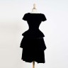 Robe en velours noir à volants. On y joint un lot de bijoux fantaisie : deux diadèmes, une ceinture brodée et deux petites broches, ainsi qu'une pochette du soir perlée.
