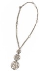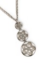 Collier double chaîne en métal argenté entrecoupée d'anneaux, retenant un pendentif composé de trois fleurs ajourées contenues dans des anneaux en chute Signé Longueur : 62 cm Dimensions du pendentif : 12 x 4,7 cm