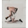 SCHIRA-SCHARI (dessinateur de presse actif vers 1930) Carpentier genou à terre, 1933 Aquarelle et lavis sur papier Signé et daté en bas à droite 35 × 30 cm "Je pense que cet aquarelliste de génie, dessinateur de presse actif vers 1930, a représenté Carpentier un genou à terre. Il écrivit et illustra en 1945 "La santé par le rire : quarante conférences optimistes de l'oncle Hercule. Sport, chasse, pêche"."