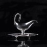 Saucière navette en argent à plateau attenant, anse à têtes d'animaux, à décor de palmettes, feuilles d'eau et oves, base à semis de fleurs. ( Poids : Env. 730 g.)