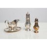 Saupoudroir (poids 193 gr) et une saucière (Poids 522 gr) en argent anglais Poids total : 715 gr On joint : Un saupoudroir en métal argenté H 20,5 cm