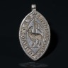 Sceau pendentif en bronze en forme d'amande avec bélière, Gourgoulain, prêtre. Champ : agneau vexillifère, symbole de la Résurrection; orle : légende en lettres capitales entre deux fiets S.(Sigillum) R. (Reverendi) D. (Domini) COURGOULAIN PRESBITER . XIIIe siècle H totale 4,9 cm