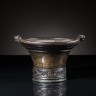 Seau à bénir en bronze avec anse mobile en fer forgé. Corps fortement évasé souligné de fiets sous le col ; sur la base, ligne sinueuse et feuillages accompagnés d'une inscription latine en lettres gothiques te deum laudamus (Nous te louons, Dieu) ; attaches de l'anse en forme de tête d'animal stylisée. Vers 1400 H jusqu'au bord : 13,8 cm × Ø 19,5 cm Modèles similaires dans l'ouvrage d'A-E TheuerkauffLiederwald, Mittelalterliche Bronzeund Messinggefässe, Berlin, 1988, n°56 et 57.