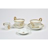 une tasse à chocolat et sa sous tasse, une tasse à chocolat et une patelle à beurre en porcelaine à décor doré de frises de laurier et filets, du service des Princes.