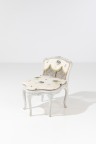 peint à décor de fleurettes reposant sur cinq pieds cambrés terminés en volutes. Dossier canné garni de tissu à franges. Époque Louis XV H 70 × L 55 × P 62 cm
