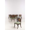 Suite de huit chaises en acajou a dossier incurvé à décor ajouré d'un velum, reposant sur des pieds avant et arrière en sabre ; (accidents).