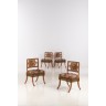 Suite de quatre chaises en bois peint et doré, avec des applications de tissu au dossier, à dossier incurvé à décor ajouré d'un vélum, reposant sur des pieds avant et arrière en sabre.