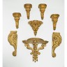 Suite de quatre consoles d'appliques en stuc doré sculpté de feuilles d'acanthe, deux consoles et deux éléments d'architecture en bois mouluré sculpté et doré à décor de volutes et rinceaux feuillagés.