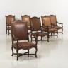 Suite de six fauteuils en noyer sculpté à dossier plat à épaulement, à décor de feuillages, palmettes, rocailles et coquilles ; repo...