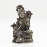 Petite statuette de Tara verte en métal argenté, assise en rajalilasana sur un double lotus tenant des tiges de lotus.
