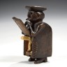Tabatière à caractère licencieux en bois sculpté représentant un ecclésiastique barbu et coiffé d’une barrette en train de priser, les mains devant le visage ; abattant sur le devant découvrant ses jambes et un phallus monté à ressort ; petite porte au dos. XIXe siècle H 11,2 cm (Bord du chapeau cassé et recollé)