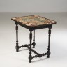 table cabaret en chêne, piétement avec entretoise en H entièrement tourné en balustres, plateau aux angles abattus recouvert d’une tapisserie au petit point représentant une dame de qualité. Fin du xVIIe siècle H 69 x L 75,5 x P 59 cm (renforts sous le plateau)