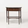 Table console en noyer teinté de forme demi lune, la ceinture ouvrant à un tiroir reposant sur des pieds fuselés réunis par une tablette d’entretoise ; dessus de marbre gris Sainte Anne. Epoque Louis XVI (accidents). h 83 × L 82 × P 41 cm (Trace d'estampille).