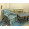 Table en bois laqué rechampi bleu, 74x78x50 cm, fauteuil, 66x66x66 cm et banquette, 50x60x40 cm Sillón, banqueta y mesa de TV