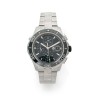 Cadran noir avec index bâtons appliqués et aiguilles luminescentes, trois compteurs pour la fonction chronographe, minuterie chemin de fer et date à guichet, signé