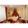 Cama, dosel, cortinas, pareja de lámparas de sobremesa y banqueta y dos mesillas