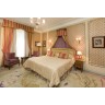 Cabecero, dosel, cortinas, pareja de mesillas, pareja de lámparas de sobremesa y mesa TV