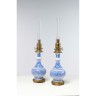 Paire de lampes de forme balustre en céramique émaillée blanche et bleue à décor d'Iznik , base en bronze doré à décor ajouré.