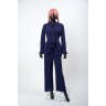 Thierry MUGLER 1990's ENSEMBLE en crêpe polyester indigo : veste galbante légèrement drapée sur le devant, bouton pressions, pantalon T 42 Mini salissures