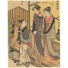 Torii Kiyonaga (1752-1815) Chuban tate-e, de la série "Haifû yanagidaru", poèmes humoristiques de l'oreiller, deux courtisanes en vêtement de nuit donnent l'ordre de chasser un client à une servante avec une lanterne. Le poème : "Au moment de se quitter, on ne peut terminer ses adieux". Signé Kiyonaga ga. 23,9 × 18,5 cm (Coupé, doublé) Provenance : Proviendrait de l'ancienne collection Haviland, puis Javal et acheté en août 1946 chez Densmore.