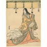Torii Kiyonaga (1752-1815) Chuban tate-e de la série "Onna fûzoku masu kagami", miroir des coutumes de femmes, dame de cour avec un éventail sous un store de bambou. Signé Kiyonaga ga. Vers 1790. 25,5 × 19 cm Référence : Estampe similaire conservée au Museum of Fine Arts, Boston, n°11.19402