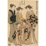 Torii Kiyonaga (1752-1815) Oban tate-e de la série "Hinagata wakana no hatsu moyô", dessins pour la mode, le style de la nouvelle année frais comme des légumes nouveaux, l'oiran Utagawa de la Yotsumeya et les deux kamuro Utano et Utaki se baladant, vêtues de kimono richement décorés. Signé Kiyonaga ga, cachet d'éditeur de Nichimuraya Yohachi (Eijudo). Vers 1783. 36,5 × 24,7 cm (Pliure médiane, doublé, légèrement coupé) Provenance : Proviendrait de l'ancienne collection Haviland 3e vente février 1924, puis Javal, et acheté en août 1946 chez Densmore.