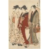 Torii Kiyonaga (1752-1815) Oban tate-e de la série "Tôsei yûri bijin awase", le concours des beautés contemporaines des quartiers de plaisir, planche "Tatsumi no en", le charme du Sud-Est, deux jeunes femmes et un serviteur avec une caisse à maquillage. Signé Kiyonaga ga, cachet de collectionneur Hayashi. 38 × 24,6 cm Référence : Estampe similaire conservée au Museum of Fine Arts, Boston, n°21.5577. Provenance : Proviendrait de l'ancienne collection Rousselot, vente juin 1950, puis acheté en juillet 1950, chez Densmore.