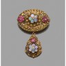 Broche ornement en or 18k (750‰) de différents tons à décor ajouré de fleurs et feuillages très finement ciselé rehaussé de cabochons d'opale et de rubis. Elle retient un élément amovible en pampille.