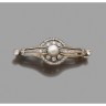 Travail des années 1915-20 Broche barrette en or jaune et platine sertie de diamants et d'une perle bouton probablement fine au centre.