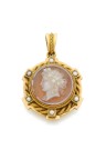Médaillon porte-souvenir en or jaune 18k (750‰) et fils d'or jaune torsadés, orné d'un camée sur cornaline à profil de Bacchante entouré de perles probablement fines Dimensions : 4,5 x 3 cm Poids brut : 15,6 g