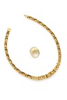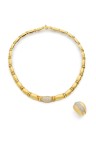 Parure en or jaune 18k (750‰) à motif central pavé de diamants taille brillant Elle comprend un collier articulé et une bague "sourire" Longueur collier : environ 40 cm Tdd : 56 Poids brut : 118,6 g