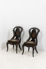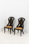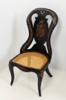 Bois laqué, décor polychrome de bouquets floraux, agrémenté de rehauts dorés et d’incrustations de nacre, assise en cannage et textile