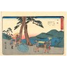 Utagawa Hiroshige (1797-1858) Aiban yoko-e, de la série "Tokaido gojusan no uchi", les cinquante- trois stations du Tokaido (Gyosho Tokaido), planche 26 "Nissaka, Sayono-nakayama Yonaki-ishi, Mugenzan chôbô", le col de Sayo à Nissaka. Signé Hiroshige ga, éditeur Yezakiya, vers 1841-44. 22,6 × 34 cm (Marge renforcée)