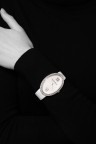 Lunette sertie de diamants, cadran guilloché laqué blanc, chiffres romains pavés de diamants, aiguilles en or, remontoir serti d'un diamant