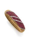 Au centre quatre lignes de diamants taille brillant délimitent un motif pavé de rubis ronds