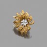 VAN CLEEF & ARPELS. Années 1960. Clip "Dahlia" en or jaune 18k (750‰) granité, orné au centre d'un motif pavé de diamants taille brillant. Signé et numéroté 92074. Hauteur : 4 cm Poids brut : 18,1 g