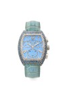 Cadran : bleu azuré avec trois compteurs pour la fonction chronographe, index bâtons et chiffres arabes stylisés, signé