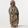 Vierge de Calvaire en noyer sculpté et polychromé. Debout, les mains jointes sur le ventre, elle penche la tête vers la gauche ; voile épais surplombant le visage à l'expression affligée. Espagne, milieu du XVIe siècle Hauteur : 66,5 cm (quelques accidents à la polychromie et manques à la terrasse)