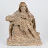 Vierge de Pitié en pierre calcaire sculptée. Assise, Marie tient son Fils devant elle ; voile