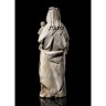 Vierge à l’Enfant en pierre calcaire sculptée en ronde-bosse avec restes de polychromie. Debout, très légèrement déhanchée, elle porte l’Enfant sur son côté gauche, la tête tournée de l’autre côté ; visage aux formes pleines, avec yeux fendus, nez droit , bouche menue et menton aigu ; sa tête porte une couronne posée sur un voile laissant apparaître la chevelure ondulée qui encadre le visage ; un pan du voile tombe dans le dos en dessinant deux cœurs symétriques ; elle est revêtue d’une robe et d’un manteau dont un large pan revient sur le devant ; l’Enfant habillé d’une longue tunique tient une rose entre ses deux mains. Est de l’Ile de France, premier quart du XVe siècle H 80 cm (quelques manques notamment à la couronne et la main droite de la Vierge)