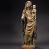 Vierge à l’Enfant en tilleul sculpté, polychromé, et doré, dos creusé. Debout et déhanchée, la tête, inclinée sur la droite, elle porte l'Enfant nu sur son côté gauche ; visage d'une grande douceur, avec front bombé, yeux fendus aux paupières inférieures gonflées, bouche menue aux lèvres bien dessinées, petit menton rond ; elle est vêtue d’une longue robe se cassant au sol et d’un manteau posé sur son épaule droite dont un pan couvre le devant de son corps en formant un tablier ; plis souples en façade et en cascade sur les côtés. Salzbourg, vers 1380 H 74 cm (manques à l’attribut, restaurations) Avec son déhanchement et sa tête inclinée, cette Vierge annonce les Belles Madones de l'école bohémienne dont le type a été créé vers 1400. Ici, le dessin en S de la silhouette n'est pas encore très accusé comme il le sera plus tard. Son bon état général, son élégance longiligne, la joliesse de son Enfant en font une sculpture d'une rare qualité.
