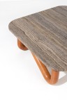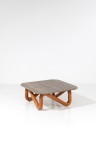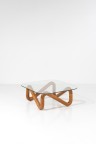 Table basse Noyer et verre Modèle créé en 1952 H 37×L 91,5×P 91,5cm Note : Un plateau en travertin pourra également être remis à l'acquéreur.